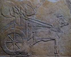 Assyrische strijders in door gepaard getrokken strijdwagen.