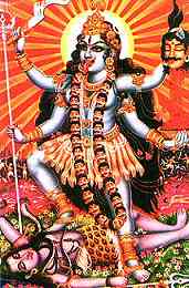 Kali is het vernietigende aspect van de Grote Godin (Devi). Een van haar verschijningsvormen is als de Zwarte. Ze wordt afgebeeld staande op het uitgestrekte lichaam van Sjiva, liggend op een lotusbed. Ze is een gruwelijke verschijning. Ze likt bloed op met haar uitgestoken tong. In haar ene linkerhand draagt ze een bebloed zwaard, waarmee ze de illusie doorsnijdt; in haar andere linkerhand heeft ze een afgehouwen hoofd, vastgehouden aan het haar. Haar ene rechterhand brengt zegen, met haar andere wenkt ze haar volgelingen. Volgens een andere beschrijving is het lichaam van haar minnaar uiteengereten, terwijl zijn fallus omhoog is gericht. Zijn bloed stroomt over de aarde. Karakter en uiterlijk van Kali komen in dit aspect overeen met de Griekse Medusa en de gorgonen.